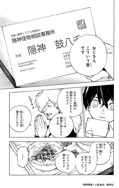 Natsuha is taken to Tokyo by the Hidden God to work as a detective’s assistant. Kaibutsu Jiken” starts off as a mystery, with Natsuha solving cases brought to him by the Hidden God. Natsuha’s first case in Tokyo is that of a Nekomata who scares human men. The client is a man who has fallen in love with a Nekomata. Other cases include the strange death of a worker in the river flowing under Shibuya, and an undercover investigation into a factory controlled by a monster called Kanomba, where Natsuha’s activities as a detective specializing in monsters are depicted.